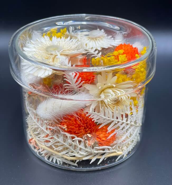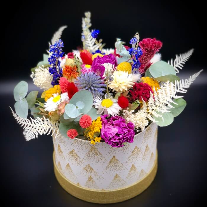 VoirBouquet de fleurs séchées produites dans l'Aveyron et l'Allier. Dimension écrin H9 D6 Prix 18€ Livraison Rodez et alentours seulement. Présente au marché de Noël de Rodez du 14 au 24 décembre 2020.