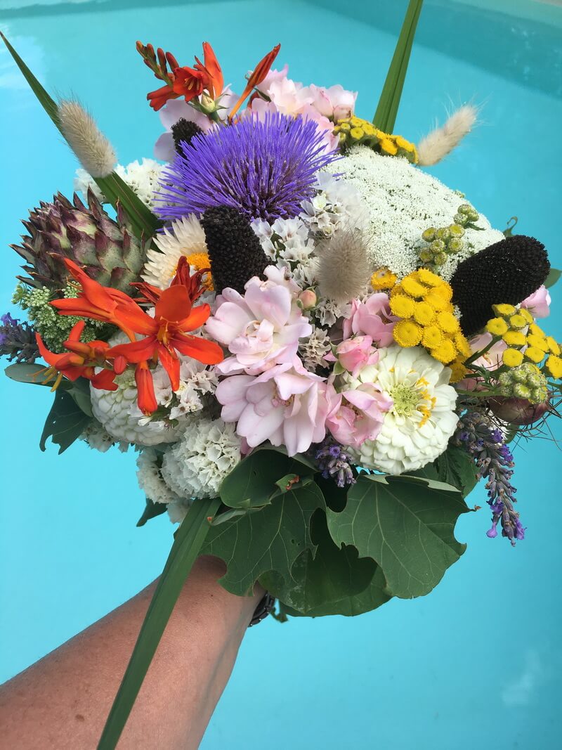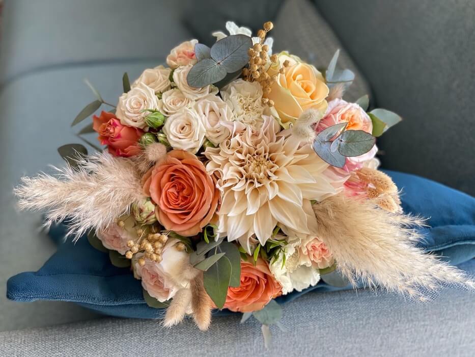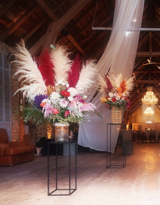 VoirToute en couleur! composée de pampa et de fleurs fraiches. Possibilité de choisir les tons, les fleurs et la forme du fleurissement.
