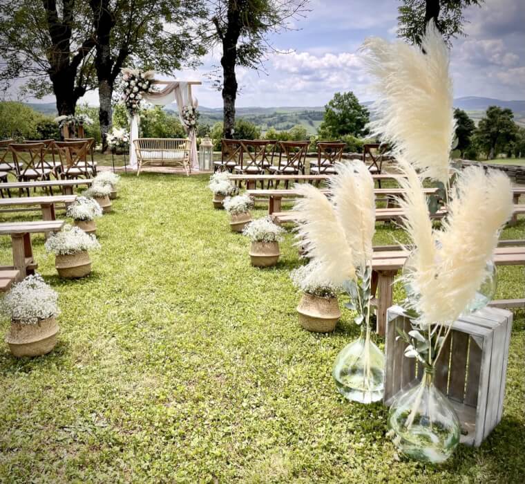 VoirAllée de cérémonie avec des dammes Jeanne et bouquets de pampas et eucalyptus