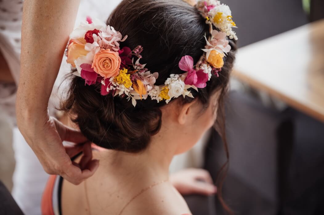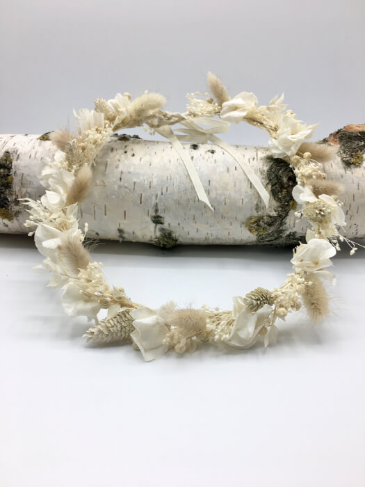 VoirCouronne en fleurs stabilisées (fleurs naturelles préservées a base de glycerine végétale) pour garder ce beau souvenir après votre mariage. Couleur, forme selon vos envies.