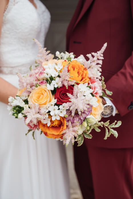 VoirUn bouquet aux couleurs chaudes, tout en douceur avec des astibes, des roses et des bouvardias.