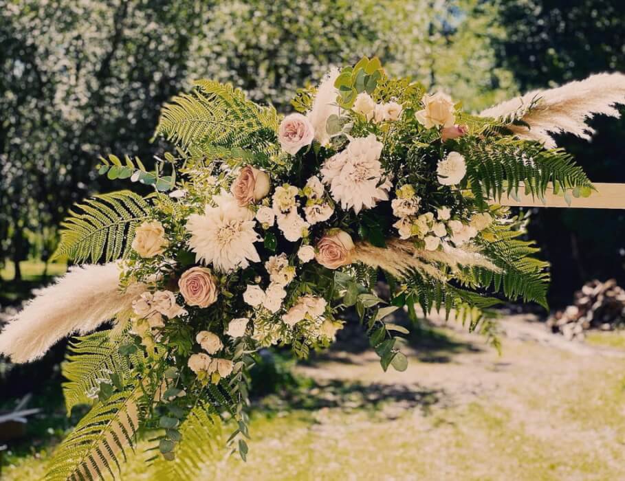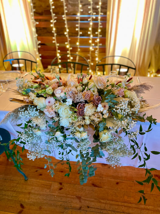 VoirToute en couleur! composée de pampa et de fleurs fraiches. Possibilité de choisir les tons, les fleurs et la forme du fleurissement.
