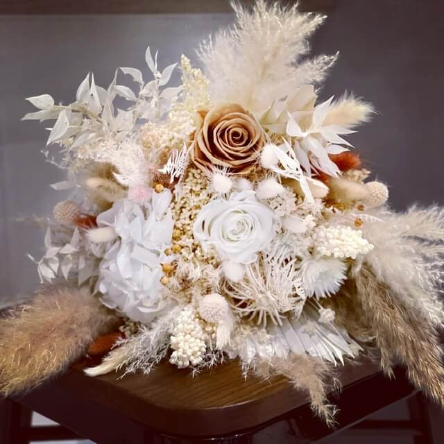 VoirBouquet de la mariée en fleurs séchées et stabilisée sur un degradé de crème et beige. Pour un bouquet durable.